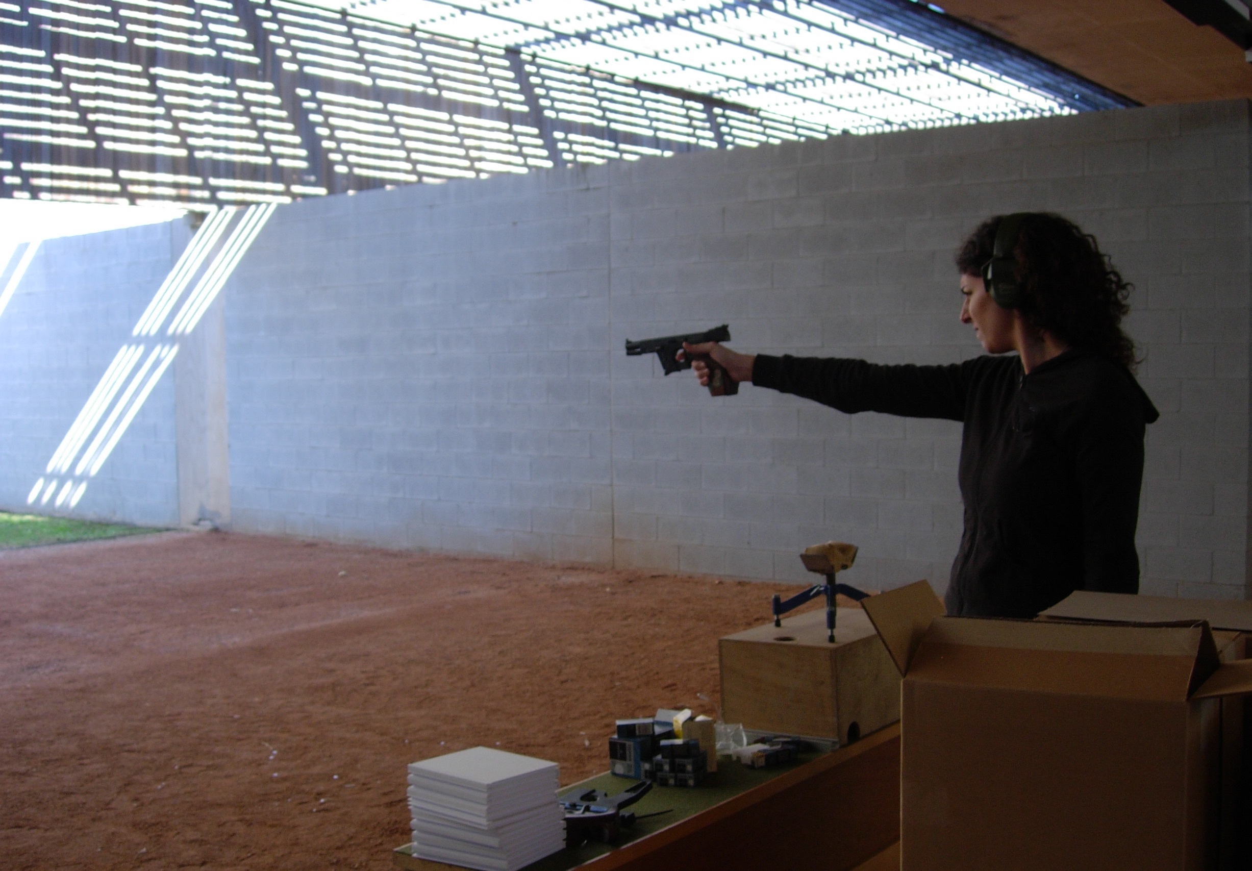 installation and performance, 1000 blank books shot by the artist with a 22-caliber gun, 67 photographs, wood.