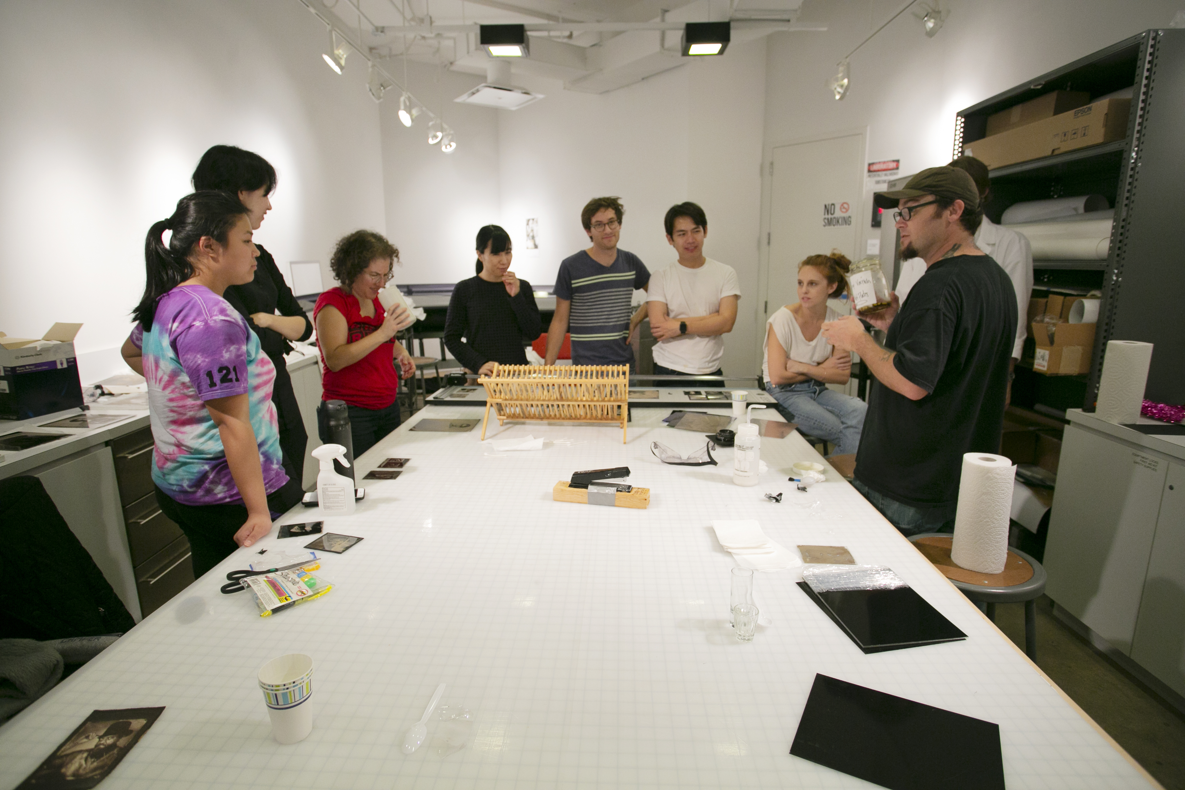 The Printmaking Studio and Riso Lab are located on the fourth floor of the 205 Hudson Street campus and are commonly used by qualified students in the MFA Program. The Printmaking Studio and Riso Lab have two presses and two riso machines, along with a large exposure unit for silkscreen. In order to maintain a safe work environment, all students are required to participate in a short orientation (and a workshop if they do not have experience in printmaking techniques) prior to using these facilities. Technical staff is available to answer questions and maintain the equipment, and workshops are conducted throughout the semester. For more information contact Nicholas D'Ornellas, MFA Printmaking Studio Technician: nick.hunterprint@gmail.com or Eva Parra, MFA Riso Lab Technician: hola@calipsopress.com.