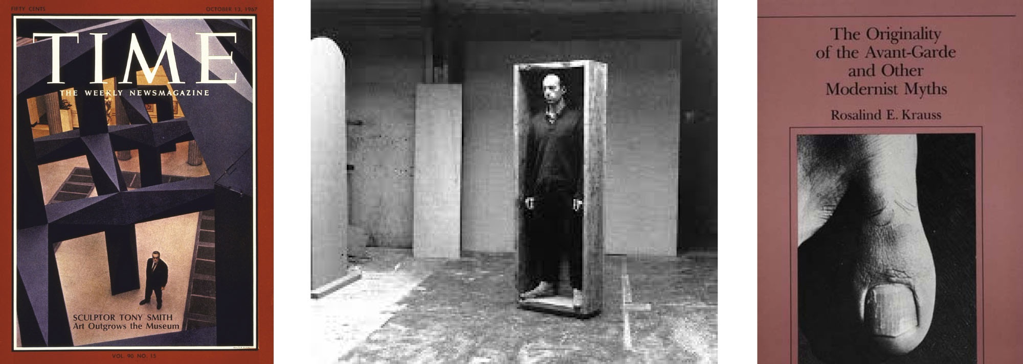 Left: Tony Smith on the cover of Time Magazine. Middle: Robert Morris at Green Gallery. Right: Rosalind Kraus